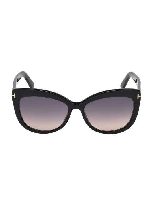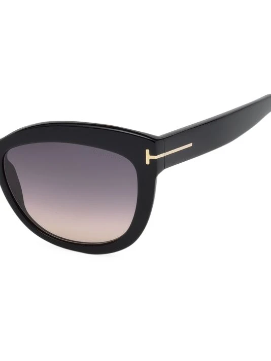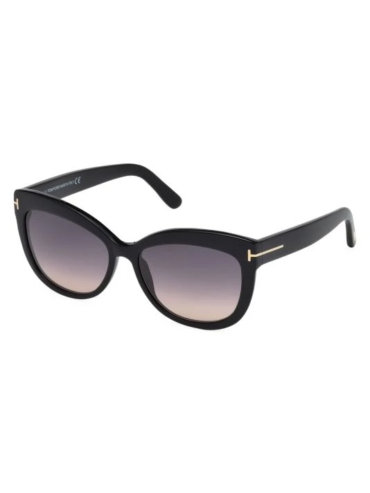 Sophisticated cat eye sunglasses in shiny black acetate with gradient grey polarized lenses and goldtone logo temple detail