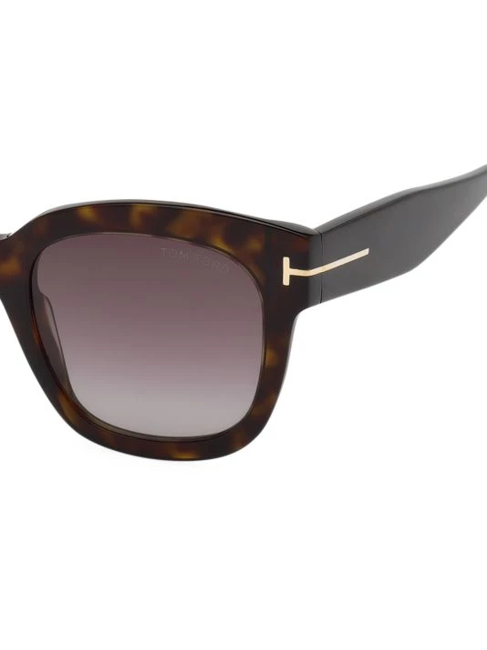 Feminine oversized soft square sunglasses in bold dark havana acetate with gradient polarized brown lenses and goldtone logo temple detail.