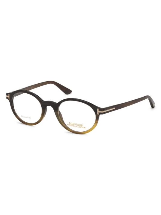 Bold round frame meticulously handcrafted in Italy using ethically sourced natural horn. Hypoallergenic, offering a warm, luxe finish, the natural pattern and color variations of horn give each frame a unique, one-of-a-kind quality. The new two-piece temple construction makes lens replacement easier and helps prevent cracking, allowing for a sleek, thinner profile. Iconic hand-laid metal “T” temple detail.