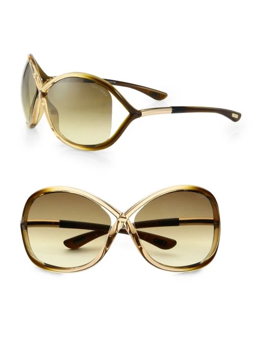 Oversized plastic frame holds a floating lens. Available in golden rose with gradient brown lens.